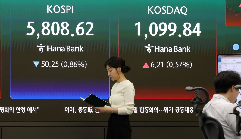 14일 한국거래소에 따르면 전날 코스피는 50.25포인트(0.86%) 내린 5808.62에 마감했다. 지난 7일 휴전 이후 시장의 반등 동인으로 작용해오던 종전 협상이 끝내 결렬로 마무리됐지만 예상보다 낙폭을 줄이며 충격을 줄였다는 평가가 나온다.