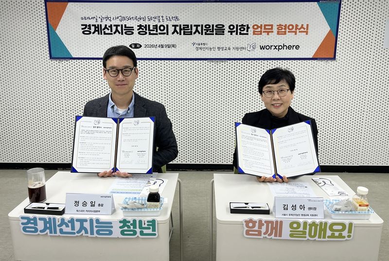 [파이낸셜뉴스] 웍스피어가 서울 경계선지능인 평생교육지원센터(밈센터)와 경계선지능 청년 자립 지원을 위해 협력한다. 경계선 지능인은 지능지수가 71~84점에 속해 지적장애와 비지적장애 경계에 있는 이들을 의미한다.