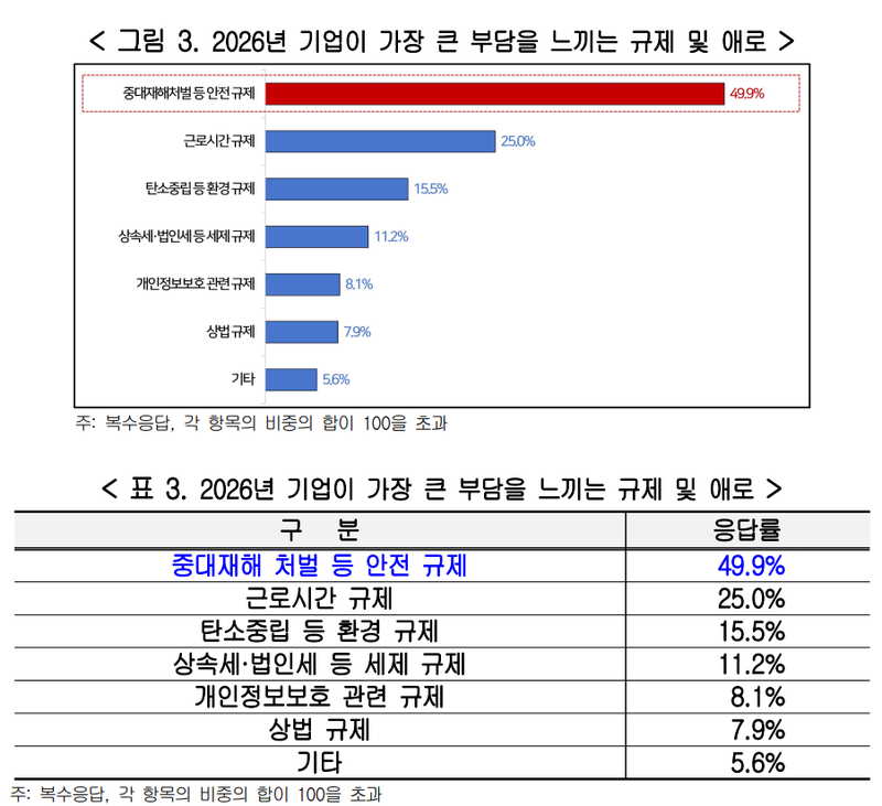 중대재해 처벌 등 안전 규제 부담 49.9%