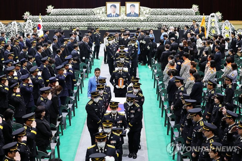 동료들의 거수경례와 애도 속에서 영결식장을 떠난 2명의 순직 소방관은 대전 현충원 소방관묘역에 안장된다.