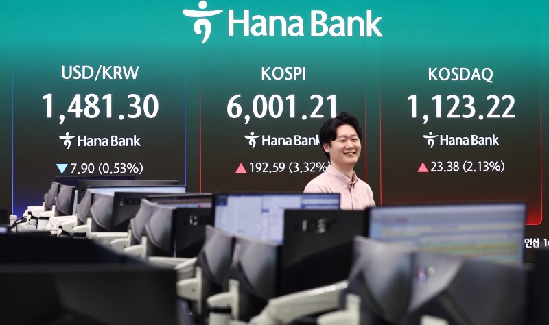14일 한국거래소에 따르면 이날 오후 2시 20분 코스피는 전일 대비 192.17p(3.31%) 오른 6000.79에 거래되고 있다. 이날 전일 대비 2.61% 오른 2960.00에 출발한 상승폭을 키우며 6026.52를 터치하기도 했다.