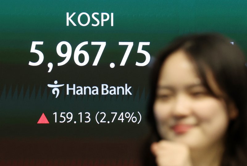 14일 한국거래소에 따르면 이날 코스피는 전일 대비 159.13p(2.74%) 오른 5967.75에 거래를 마쳤다. 이날 전일 대비 2.61% 오른 2960.00에 출발한 지수는 장중 6026.52(3.75%)를 터치하는 등 6000선 안팎에서 등락을 보였다.