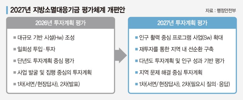 행정안전부는 14일 이 같은 내용을 담은 '2027년 지방소멸대응기금 평가·배분체계 개편안'을 발표했다.