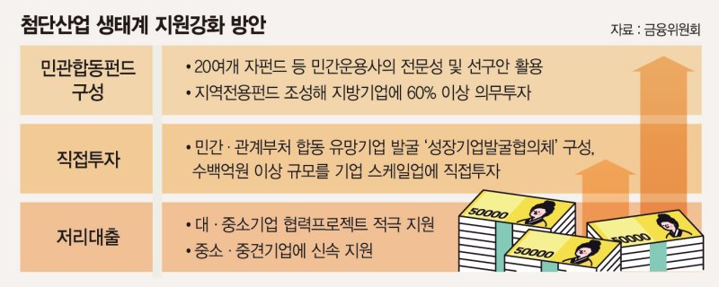 먼저 민관합동펀드를 35조원 규모로 조성해 스케일업, 10년 이상 초장기 기술펀드, 인수합병(M&A), 지역전용 펀드 등으로 세분화해 자금 공급의 공백을 메울 계획이다. 20여 개의 자펀드로 나눠서 운영, 과거 정책성 펀드가 시도하지 않은 영역을 지원해 첨단산업 생태계 및 핵심 전략 기술을 육성하기로 했다. 또 지방기업에 60% 이상 의무적으로 투자하는 지역전용펀드를 매년 2000억원 이상 조성해 지방첨단산업생태계 지원을 강화한다.