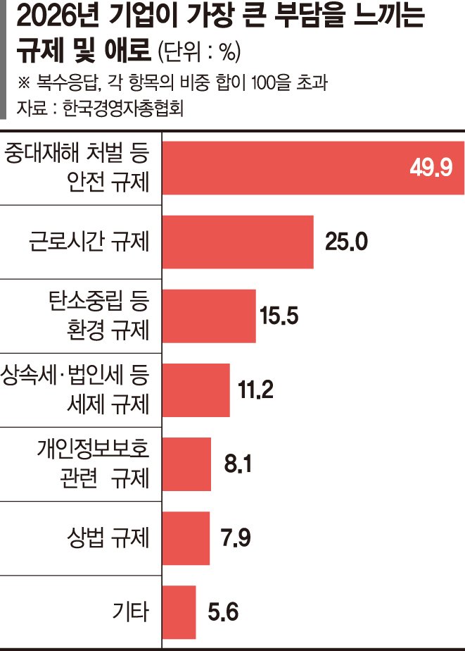 한국경영자총협회(경총)는 전국 50인 이상 기업 517개사(응답기업 기준)를 대상으로 '2026년 기업규제 전망조사'를 실시한 결과 올해 기업이 가장 큰 부담을 느끼는 규제(복수응답)로 '중대재해처벌 등 안전 규제'가 49.9%로 압도적 1위를 차지했다고 14일 밝혔다. 응답기업 2곳 중 1곳이 중대재해처벌법을 최대 부담 규제로 꼽은 셈이다. 이어 '근로시간 규제'(25.0%) '탄소중립 등 환경 규제'(15.5%) '상속세·법인세 등 세제 규제'(11.2%) 순으로 집계됐다.