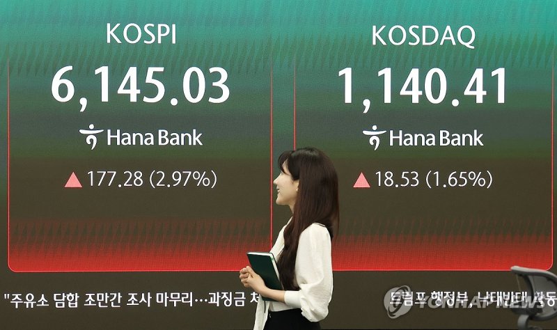 이날 오전 9시 18분 현재 코스피는 전장보다 185.55포인트(3.11%) 상승한 6,153.30에 거래되고 있다.