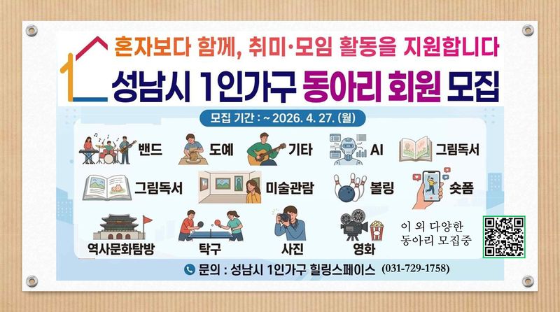 성남시는 같은 취미를 가진 1인 가구들로 구성된 동아리에 연간 최대 70만원의 활동비를 지원한다고 15일 밝혔다.