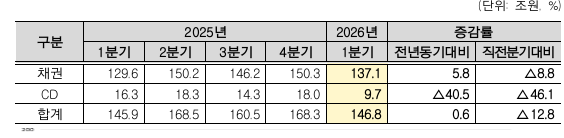 CD의 등록발행 규모는 약 9조7000억원으로 전년 동기(16조3000억원) 대비 40.5% 감소, 직전 분기(18조원) 대비 46.1% 감소했다.