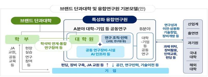 핵심은 브랜드 단과대학과 특성화 융합연구원을 하나로 묶는 방식이다. 기업은 펀딩과 장비를 대고 교원을 겸직으로 파견한다. 대학은 공간과 연구인력을 제공하고 기술을 이전받는다. 학부생은 현장실습과 연구에 참여하고, 대학원생은 융합연구원에 이중 소속돼 전문연구원에 준하는 월 200∼300만원의 연구장학금을 받으며 기업의 실제 프로젝트를 수행한다. 산업계·출연연·과기원·국내외 대학이 동시에 연결되고, 연구 성과는 기술창업과 상용화로 이어지는 출구까지 설계돼 있다. 학부에서 시작해 대학원, 연구소, 기업으로 이어지는 인재 파이프라인을 한 지붕 아래 구축하겠다는 것이다.