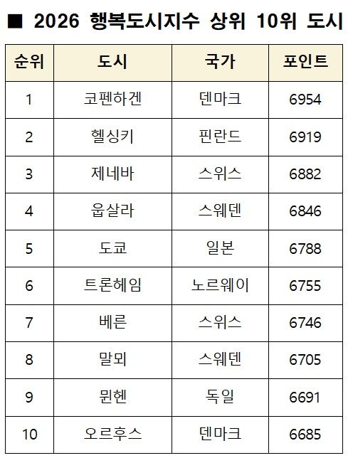 행복도시지수는 프랑스 삶의 질 연구소와 영국 행복도시 허브가 공동 발표하는 국제 평가로 전 세계 약 1000개 도시를 대상으로 시민·거버넌스·환경·경제·건강·이동성 등 6개 분야를 종합 분석해 순위를 매긴다.