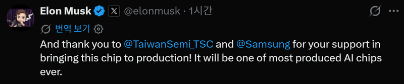 머스크 CEO는 "이 칩을 실제 생산까지 이끌어주는 데 도움을 준 TSMC와 삼성전자에게 감사를 표한다"며 "해당 칩은 역사상 가장 많이 생산되는 AI 칩 중 하나가 될 것"이라고 전했다. 다만 이 과정에서 머스크 CEO는 실제 TSMC 계정이 아닌 이름이 유사한 대만 반도체 회사 TSC의 계정을 인용했다.