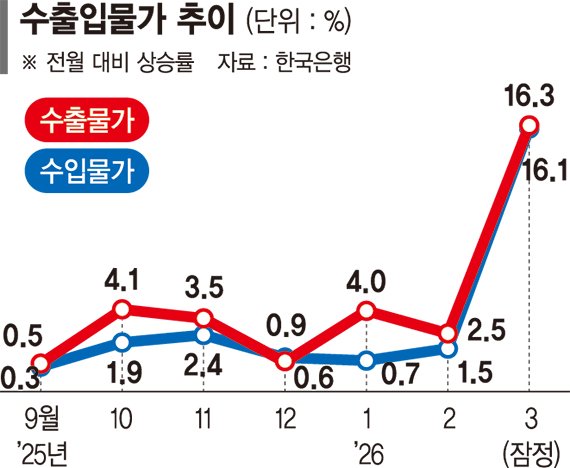 15일 한국은행이 발표한 '2026년 3월 수출입물가지수 및 무역지수'에 따르면 지난달 원화 기준 수출물가지수는 전월 대비 16.3% 올랐다. 지난해 7월(0.8%)부터 시작해 9개월을 연달아 오르고 있다. 특히 이번 상승 폭은 1998년 1월(23.2%) 이후 28년2개월 만에 최고치다.