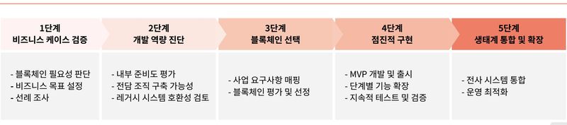 이와 관련 윤 이사가 제시한 5단계 프레임워크는 △블록체인의 대체불가능한 가치와 3~5년 투자수익률(ROI) 산출 △블록체인 전담조직 구축과 레거시 시스템 호환성 검토 △비용 구조의 종합 평가 △최소기능제품(MVP) 우선 출시 △외부 파트너·고객사의 투명성·신뢰성 확보 등이다.