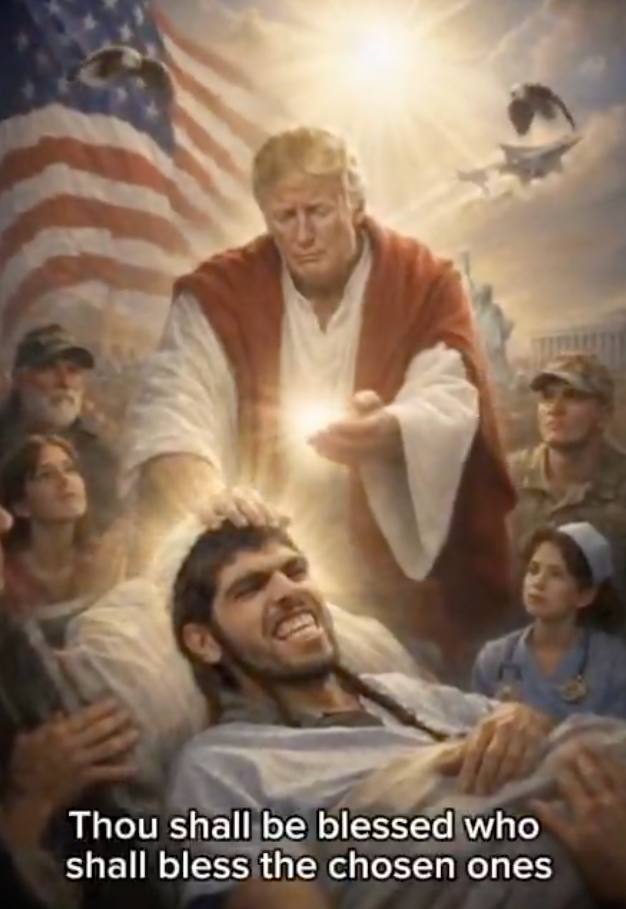 지난 12일 트럼프 대통령은 소셜미디어 트루스소셜에 자신을 환자를 치유하는 예수로 묘사한 AI 생성 그림을 올렸다가 12시간 만에 삭제했다. 그림 속 트럼프 대통령은 성경 속 인물과 유사한 복장으로 환자의 이마에 손을 얹고, 다른 손에서는 빛이 나오고 있다. 주변에는 성조기와 자유의 여신상, 국조 흰머리독수리 등 미국의 상징물이 자리하고 군인, 간호사 등 다양한 사람들이 트럼프 대통령을 우러러보고 있다.
