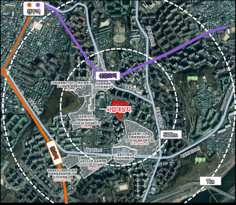 대상지는 5호선 신금호역 역세권에 위치, 강북 도심권(CBD)과 여의도(YBD)로의 접근성이 좋다. 인근에는 응봉근린공원, 대현산 배수지 공원 등 다수 공원이 인접하고 있고 왕십리 지역과도 가깝다.
