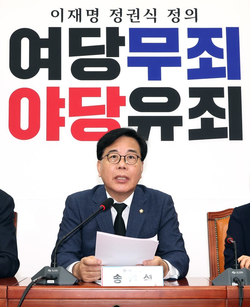 송 원내대표는 검·경 합동수사본부가 전재수 민주당 부산시장 후보의 '통일교 금품수수' 의혹과 관련, 불기소 처분을 내리자 "전재수 일병 구하기"라고 비판했다. 그는 최근 정원오 민주당 서울시장 후보에 대한 '봐주기 의혹'까지 제기했다.