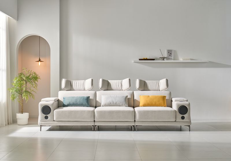 소비자 선택의 폭을 넓히기 위해 소재와 기능을 세분화한 3가지 모델도 주목할 만하다. '호라이즌 모션 슬라이딩 조야 블루투스 스피커 소파'는 측면의 스마트 제어 패널을 통해 스마트폰 무선 충전과 USB 포트 연결이 가능하다. '해피니스 모션 슬라이딩 실리콘 비건가죽 모듈형 소파'는 관리의 편의성과 고급스러운 미감을 중시했다. '수니 모션 슬라이딩 갤럭시 패브릭 모듈형 소파'는 신소재 기능성 '갤럭시 패브릭' 원단을 적용해 밝은 색상임에도 오염 걱정 없이 사용할 수 있다는 설명이다.