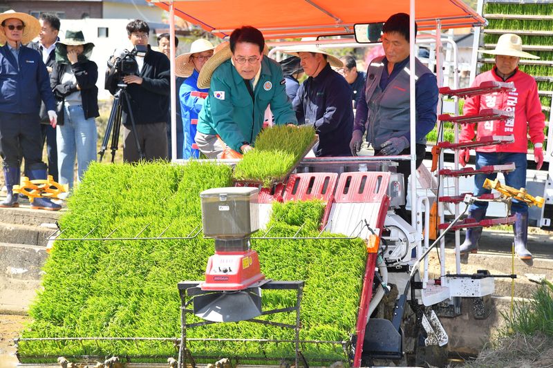 【파이낸셜뉴스 울산=최수상 기자】 올해 풍년을 기원하는 울산지역 첫 모내기가 16일 울주군 두서면 전읍리 최현식씨 논에서 진행됐다.