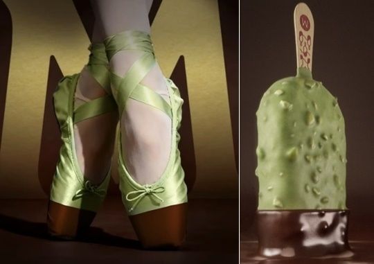 광고에는 겉 표면에 피스타치오와 초콜릿이 조합된 아이스크림과 같은 색상이 섞인 발레 슈즈 이미지, 여성의 발을 강조한 장면 등이 담겼다.