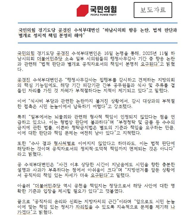 공경진 수석부대변인은 이날 논평을 내고 2025년 11월 하남시의회 더불어민주당 소속 일부 시의원들의 행정사무감사 기간 중 향응 논란과 관련해 법적 판단과 별개로 공직자로서의 책임이 분명히 요구된다고 밝혔다.