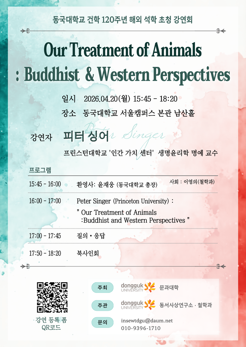 [파이낸셜뉴스] 동국대학교가 세계 석학 피터 싱어 프리스턴대학교 명예교수를 초청해 20일 동물윤리를 주제로 한 특별 강연을 연다고 16일 밝혔다. 이번 강연에서는 동물의 도덕적 지위와 인간의 책임을 놓고 불교와 서양 철학의 시각을 비교하며 생명 존중과 자비의 의미를 폭넓게 짚을 예정이다.