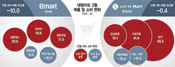 대형마트의 할인 행사도 이러한 소비 변화 흐름을 강화하는 요인으로 작용했다. 이마트는 3월 '고래잇 페스타' 등을 통해 한우·수입과일 등 주요 먹거리와 생필품을 할인 판매했고, 롯데마트도 '메가 통큰' 행사로 한우 최대 50% 할인, 화장지·세제 등 생필품 '1+1' 및 반값 프로모션을 진행했다. 고물가 환경에서 가격경쟁력이 부각된 상품에 소비가 집중되면서 할인행사가 '필수·가성비 소비' 쏠림을 더욱 뚜렷하게 만든 것으로 분석된다.