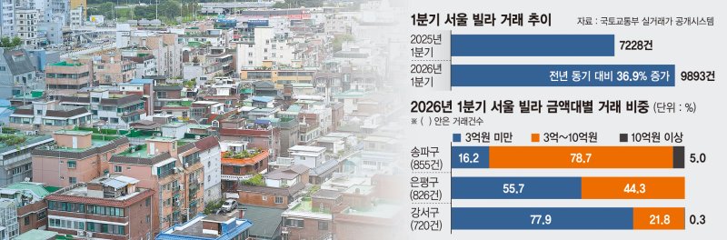 거래량이 가장 많은 곳은 855건의 매매가 이뤄진 송파구다. 이어 은평구(826건), 강서구(720건), 광진구(695건), 동작구(636건) 순으로 거래가 활발했다. 다만 자치구마다 금액대별 거래 비중은 차이가 컸다. 송파구는 3억원 미만 거래가 전체 거래의 16.2%에 그쳤고, 3억~10억원대 거래가 78.7%으로 주를 이뤘다. 10억원이 넘는 고가 빌라 거래도 5.0%(44건) 이뤄졌다.