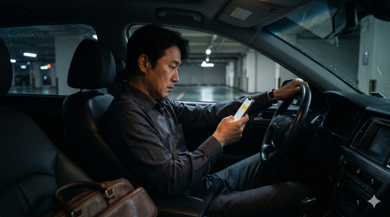 엔진 시동은 껐지만, 가장은 문을 열고 내리지 않는다. "주차장 도착했다며 왜 안 들어와?"라는 아내의 카톡이 화면에 떠도, 그저 시트를 뒤로 젖힌 채 무의미하게 유튜브 쇼츠를 넘기거나 라디오 주파수만 만지작거릴 뿐이다.