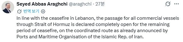 아라그치 장관은 이날 엑스(X)를 통해 "레바논의 휴전에 따라, 이란 이슬람 공화국 항만해양청이 이미 발표한 조정된 항로를 통해 호르무즈 해협을 통과하는 모든 상선의 통행이 휴전 기간이 끝날 때까지 완전히 개방된다고 선언한다"고 전했다.