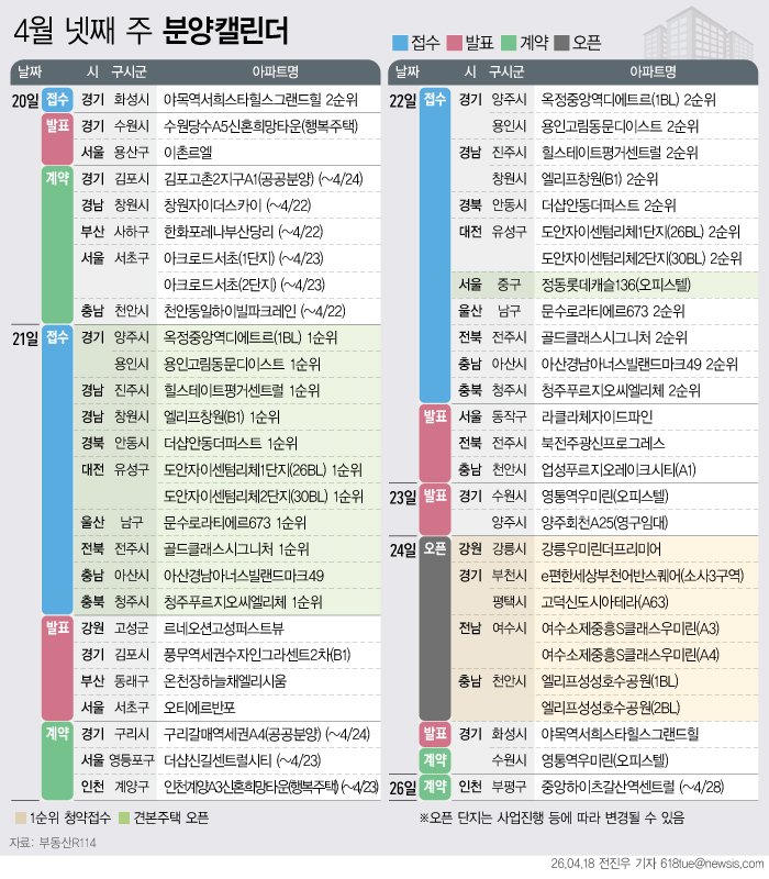 [서울=뉴시스]정진형 기자 = 4월 넷째 주 전국 11개 단지 총 9258가구가 분양을 시작한다. 이중 일반분양은 8432가구 규모다.