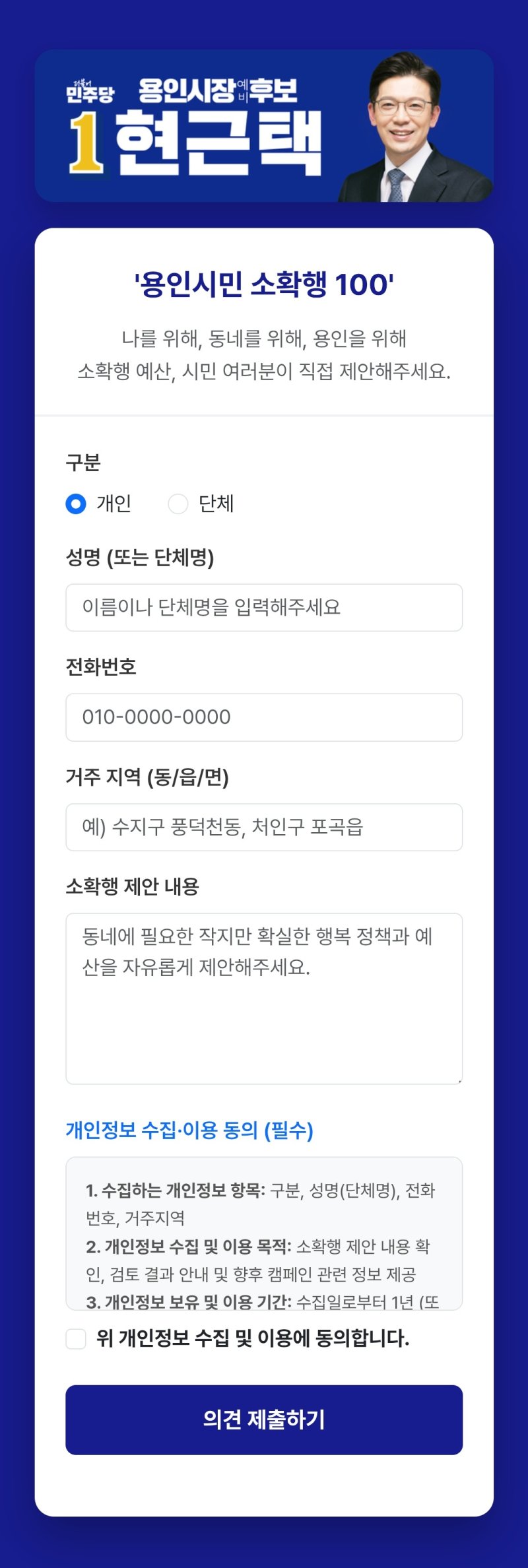 현근택 후보는 “나를 위해, 동네를 위해, 용인을 위해 필요한 작은 정책과 예산을 시민 여러분이 직접 제안해 달라”며 “시민의 아이디어가 공약으로 이어지고, 당선 이후에도 소확행 프로젝트가 계속될 수 있도록 하겠다”고 말했다.