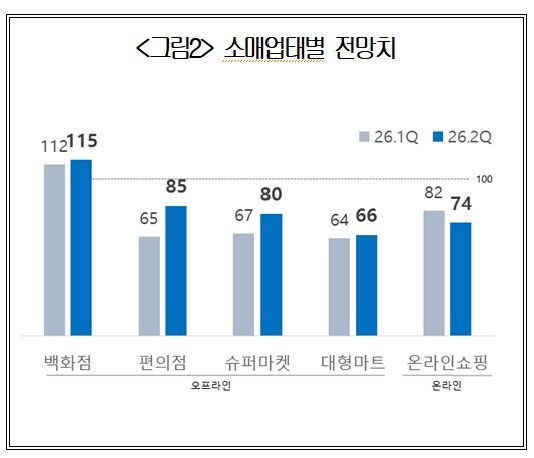 업태별로는 오프라인과 온라인 간 흐름이 엇갈렸다. 백화점은 115로 유일하게 기준치를 웃돌며 호조를 보였다. 원화 약세에 따른 외국인 관광객 증가와 소비재 수요 확대, 자산가 소비 증가 등이 긍정적으로 작용한 것으로 분석된다.