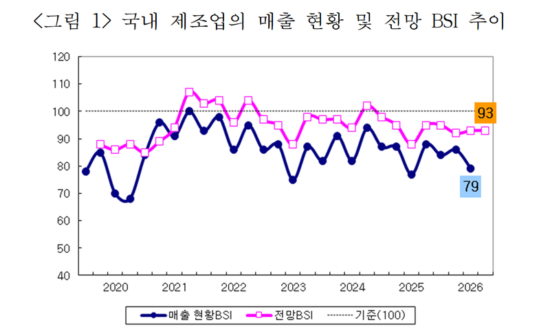 한편 1·4분기 제조업 매출 현황 BSI는 79로 전 분기보다 7포인트 하락했다. 철강(67), 섬유(65) 등 소재 부문 업종을 중심으로 부진세가 이어졌고, 무선통신기기(80), 가전(67), 바이오ㆍ헬스(73), 정유(73), 일반기계(75), 철강(67), 섬유(65) 등 대부분 업종이 하락했다.