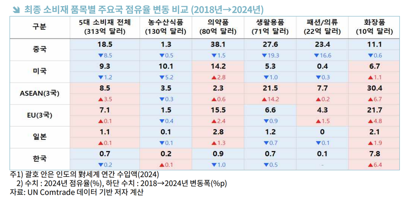 보고서에 따르면 인도 최종 소비재 수입 시장에서 한국 제품 점유율은 2018년 1.0%에서 2024년 0.7%로 낮아졌다. 수출 자체는 늘었으나 일부 품목을 제외하면 인도 전체 시장의 성장 속도를 따라가지 못하고 적절히 대응하지 못했다는 것이 무협의 설명이다.