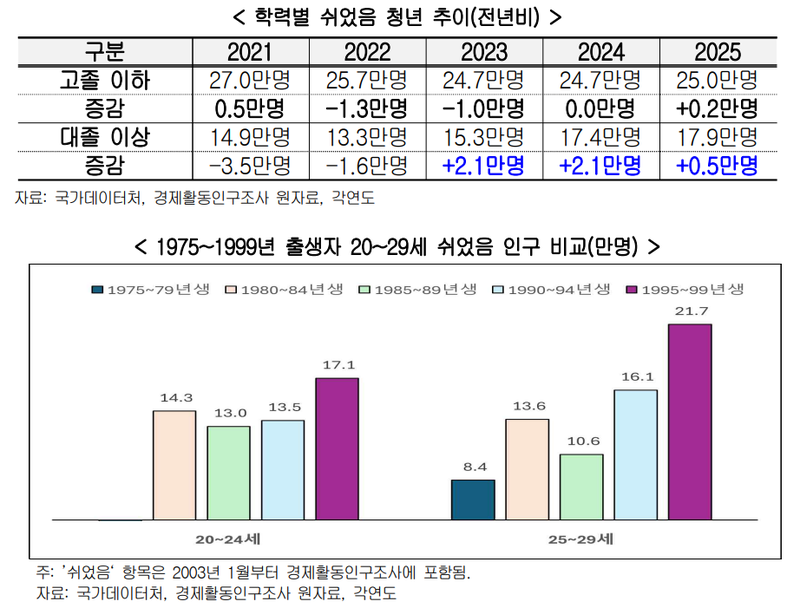 연도별로 보면 쉬었음 청년(15∼29세)은 2023년 이래 3년 연속 증가했는데 특히 대졸 이상 고학력자가 증가세를 견인했다. 대졸 이상 쉬었음 청년은 2023년 15만3000명을 기록한 뒤 2024년 17만4000명, 2025년 17만9000명으로 늘었다. 고졸 이하 쉬었음 청년은 2022년 25만7000명, 2023년과 2024년 각각 24만7000명, 2025년 25만명으로 나타났다.