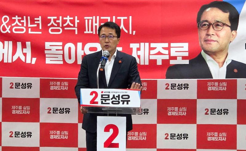 문성유 후보는 20일 오전 제주시 선거사무소에서 기자회견을 열고 "최근 실시된 KBS제주 여론조사 가상대결에서 묵과할 수 없는 공정성 훼손 문제가 있었다"고 밝혔다. 문 후보는 "이번 조사에서 다수 후보에게는 정치적 정체성이 드러나는 표기가 붙었지만 자신은 국민의힘 후보라는 정보가 빠진 채 '전직 기획재정부 기획조정실장' 등으로만 소개됐다"고 주장했다.