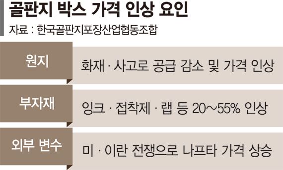 택배상자 가격 인상은 단일 요인이 아니라 복합적인 원가 상승이 겹친 결과로 풀이된다. 원지 가격 인상과 생산 차질에 더해 나프타 가격 상승으로 잉크·접착제·포장용 랩 등 석유화학 기반 부자재 비용이 오르면서 제조원가 부담을 키웠다. 한국골판지포장산업협동조합에 따르면 미·이란 전쟁 여파가 본격화된 3월 이후 인쇄용 잉크는 22%, 접착제는 55%, 포장용 랩은 약 20% 가격이 인상됐으며 일부 품목은 품귀현상도 나타나고 있다. 여기에 전쟁 장기화 우려로 수급 불안이 커지면서 기업들이 포장재 물량을 미리 확보하려는 움직임도 감지되고 있다.