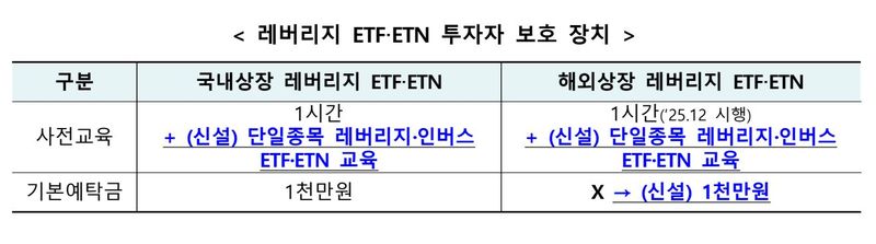 정부는 상품의 위험성을 고려해 일반 ETF 대비 강화된 투자자 보호 장치를 적용한다. 우선 분산투자라는 ETF 본연의 성격과 다르다는 점을 명확히 하기 위해 상품명에 'ETF' 표기를 금지하고, 대신 '단일종목', '레버리지·인버스' 등 특성을 직관적으로 표기하도록 했다.