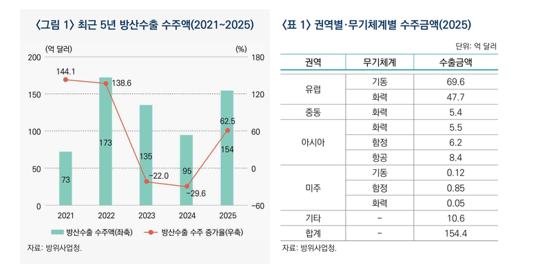 21일 산업연구원이 발표한 '파급효과로 살펴본 방산수출의 경제적·산업적 의의' 보고서에 따르면 2025년 방산수출은 154억4000만달러로 2년 연속 하락세를 딛고 반등에 성공했다. 대형 계약 확대와 수출시장 다변화에 힘입어 큰 폭의 증가세를 보인 것이다.