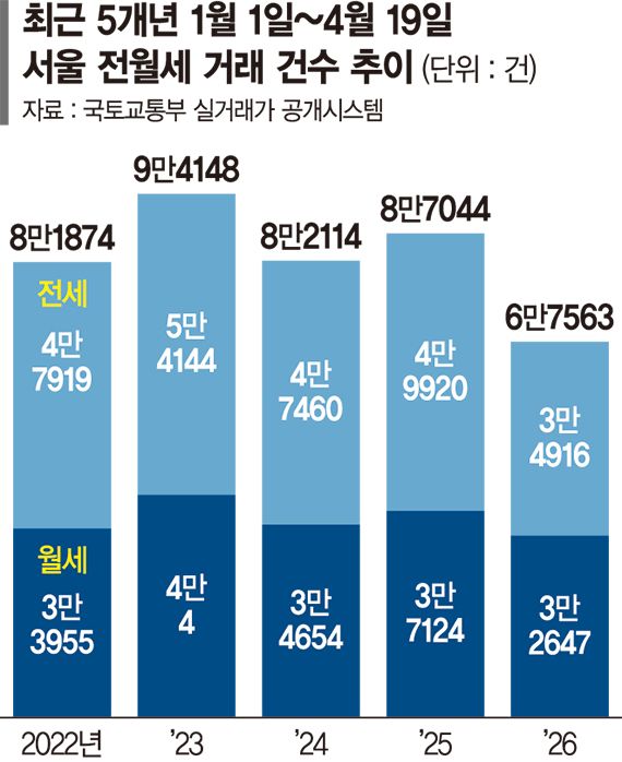 이로인해 임대차 시장에서 전세 비중도 크게 줄었다. 1월 1일~4월 19일 기준 2022년 전세 거래가 전체 거래에서 차지하는 비율은 58.5%였지만 2026년에는 51.7%로 7%p 가까이 급감했다. 2025년까지 57%선을 지켰다는 것을 감안하면 낙폭이 큰 상황이다.