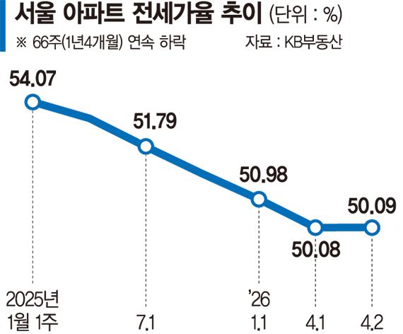 21일 KB부동산에 따르면 4월 둘째 주(13일 기준) 서울 주간 아파트 전세가율은 50.09%로 전주(50.08%) 대비 0.01%p 상승했다. 지난 2025년 1월 첫째 주(54.07%) 이후 66주, 약 1년4개월 동안 이어진 하락세를 멈춰 세운 것이다.