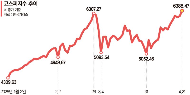 21일 한국거래소에 따르면 이날 코스피는 전 거래일 대비 169.38p(2.72%) 오른 6388.47에 장을 마감하며 사상 최고치를 경신했다. 이로써 코스피는 약 2개월 만에 장중·종가 최고치 기록을 동시에 갈아치웠다. 종가 기준 전고점은 지난 2월 26일 기록한 6307.27, 장중 기준으로는 2월 27일 기록한 6347.41이다.