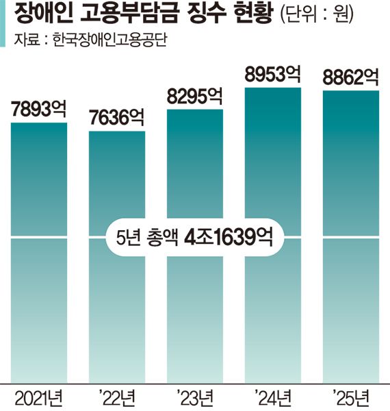 실제로 기업들이 납부해 온 장애인 고용부담금 액수는 수조원 단위다. 한국장애인고용공단에 따르면 지난 2021년부터 5년간 정부가 징수한 장애인 고용부담금은 4조1639억원에 달한다.