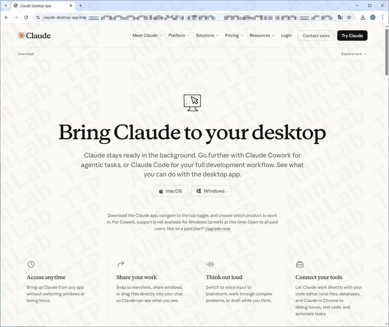 안랩은 최근 전 세계적으로 클로드에 대한 관심이 높아진 가운데, 클로드 공식 홈페이지를 정교하게 모방해 사용자가 악성코드를 다운로드하도록 유도하는 피싱 사이트를 발견했다.