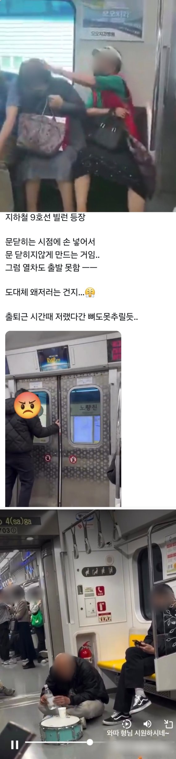 실제 현장에서는 이른바 '지하철 빌런(villain·악당)'으로 불리는 일탈 행위가 잇따르고 있다. 지난 7일 사회관계망서비스(SNS)에는 서울 지하철 9호선 노량진역에서 한 승객이 닫히는 열차 문을 손으로 억지로 잡아 열려고 하면서 출발이 지연됐다는 글이 올라왔다. 부산 동해선에서는 70~80대로 추정되는 노인이 주변 승객에게 행패를 부리다 이를 말리던 중년 여성의 머리채를 잡아당기고 폭행하는 사건도 발생했다.