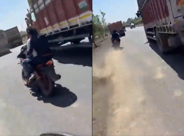 두 오토바이 운전자는 서로 추월을 시도하며 트럭들 사이를 곡예 운전했다.