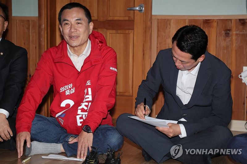 이날 강원도 양양에서 만난 김 지사는 장 대표를 향해 "옛날의 멋진 장동혁으로 돌아가 줬으면 좋겠다. 결자해지가 필요하다"면서 "원래 빨간 당이었는데 중앙당을 생각하면 열불이 나서 투표를 안하겠다는 사람이 많다"고 지적했다.