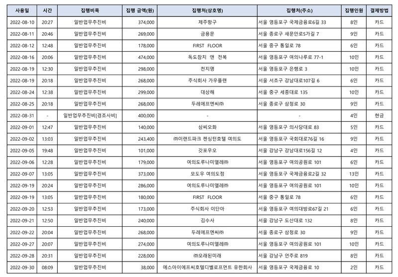 마지막은 동일 일자에 '2차', '3차'로 업무추진비를 부당 집행한 의혹이다. 지난해 4월 12일에는 밤 9시부터 11시 사이에 서울 서초구 일대에서 동일 인원(5인)으로 세 곳을 옮겨다니며 총 29만4000원을 결제했다.