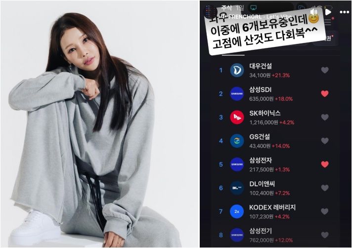 미나는 지난 21일 자신의 인스타그램 스토리에 "와우~이 중에 6개 보유 중인데 고점에 산 것도 다 회복"이라며 이날 장중 상승 종목들의 상황을 캡처해 올렸다. 미나가 공개한 사진에는 삼성전자, SK하이닉스 등 코스피 대형주 7종목과 'KODEX 레버리지' 등 8개가 보인다. 미나는 이들 중 6개 종목을 보유한 것으로 보인다.