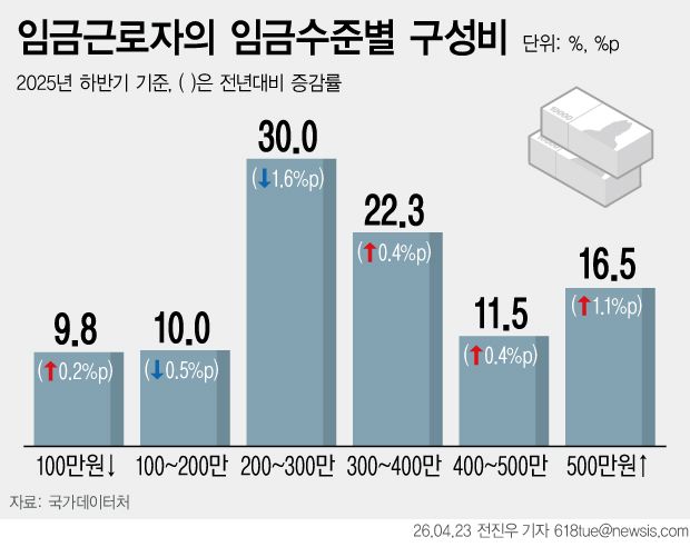 23일 국가데이터처가 발표한 '2025년 하반기 지역별고용조사(취업자의 산업 및 직업별 특성)'에 따르면 지난해 전체 임금근로자 중 임금 수준이 100만원 미만인 경우는 9.8%, 100만원~200만원인 경우는 10.0%를 차지했다.